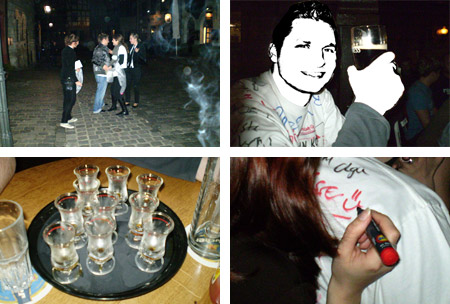Ausgestattet mit diversen Utensilien haben wir gestern Nacht acht feuchtfröhliche Stunden verbracht. Besonders die Buttons waren ein voller Erfolg: Man musste teils aufpassen, dass sie einem nicht vom Körper gerissen wurden.