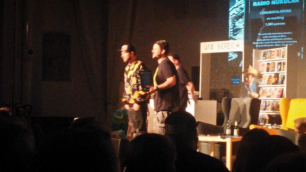 Schon morgens erreichte mich die Nachricht eines guten Freundes, ob ich nicht Lust hätte Radio Nukular live zu sehen. Er und ein Kumpel hatten Backstage-Karten für den Auftritt bekommen. Beide kennen Christian Gürnth von einem früheren Job und es sei kein Problem wenn ich mitkäme. Tatsächlich ließ ich mich (mindestens) zweimal bitten, da ich mich in dieser Runde nicht aufdrängen wollte. Dennoch sagte ich letztendlich zu. Als der Abend näher rückte, war ich durchaus aufgeregt die drei Menschen hinter den Stimmen kennenzulernen, denen ich in den letzten zwei Jahren bestimmt schon um die 150 Stunden lang gelauscht hatte.