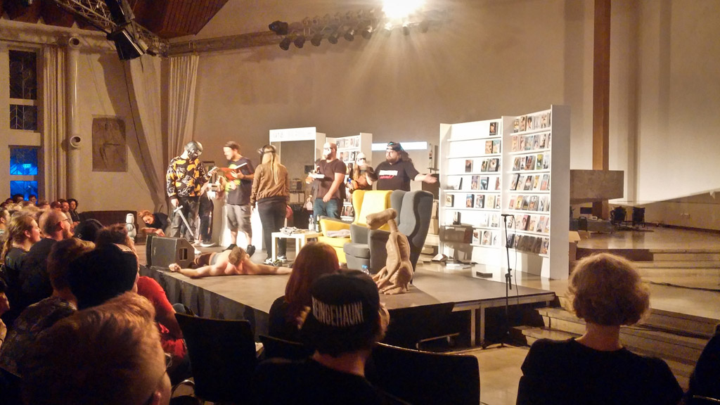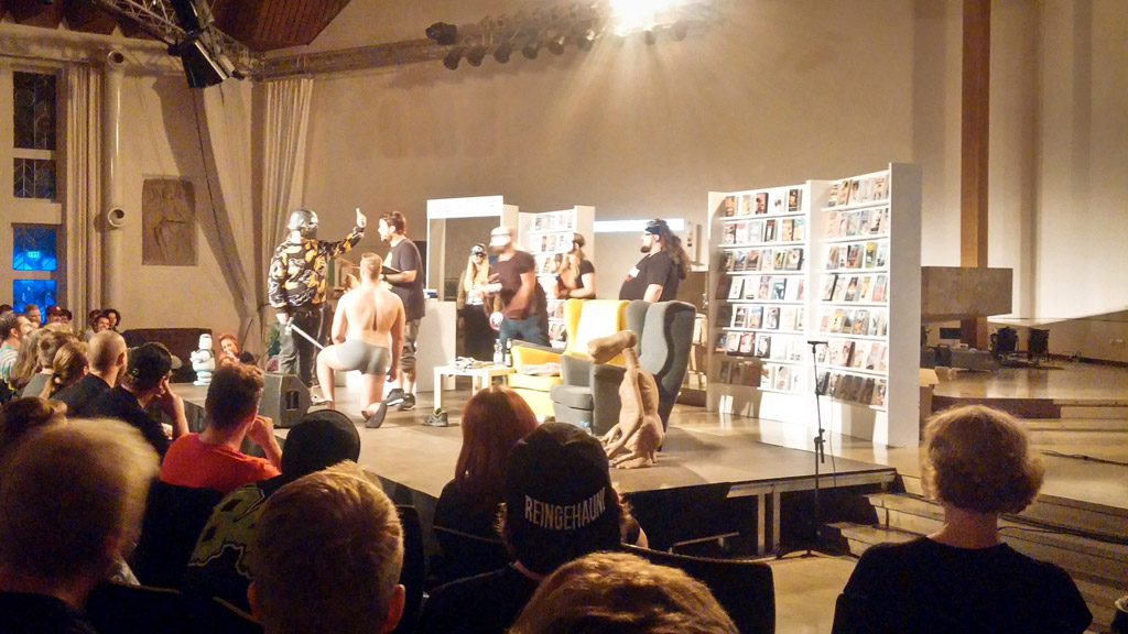 Nach dem Essen ging es zurück in die Kirche, wir bekamen als Backstage-Gäste noch Zugang zum mir Bier gefüllten Kühlschrank und dann tönte auch schon das bekannte Intro aus den Lautsprechern. Zur Show selbst möchte ich an dieser Stelle gar nicht zu viel verraten – die müsst ihr euch schon selbst anschauen. Nur soviel: Als Podcast-Hörer fühlte ich mich von den Inhalten sofort abgeholt. Der Humor ist oft zotig, die Inhalte nostalgisch und die Dynamik auf der Bühne einfach sympathisch. Auch das Publikum wurde perfekt mit einbezogen und ich war wirklich erstaunt, wie schnell der Auftritt auch schon wieder vorbei war. Das Ticket, hätte ich es denn gezahlt, hätte sich auf jeden Fall gelohnt. Vielen Dank, Radio Nukular!