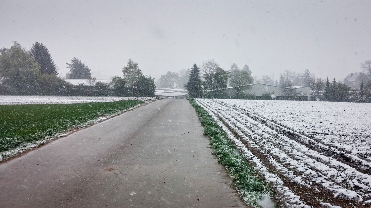 Endlich Urlaub, endlich wieder mehr Zeit zum Laufen: Mit 117 km war der April 2016 mein bester Laufmonat überhaupt und eine ähnliches Kilometerzahl erhoffte ich mir auch von diesen Osterferien. Als ich heute früh aus dem Fenster schaute, blickte ich auf eine weiße Schneedecke über Rasen und Blumen. Meine Motivation war ziemlich dahin, hatte ich mich doch schon an immerhin trockenes Frühlingswetter gewöhnt. So jedoch fühlte ich mich drei Monate zurückgeworfen. Dennoch habe ich mich aufgerafft und bin bei 0,5 °C zu einer kleinen Runde aufgebrochen: