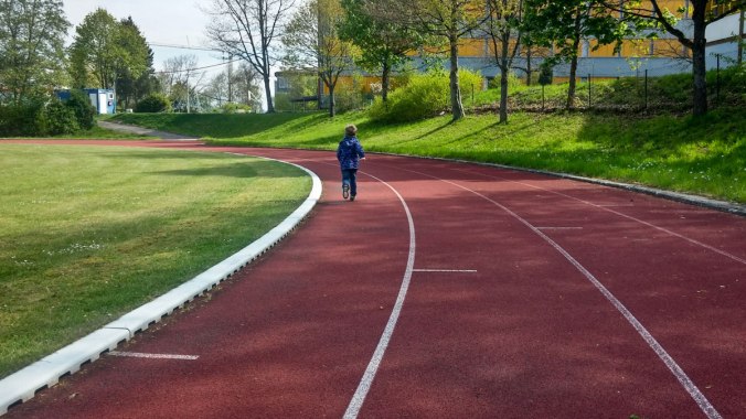 Wie beim letzten Lauf mit dem Zappelinchen haben wir einen kurzen Abstecher zur Tartanbahn gemacht, wo ich eine Runde mit dem Zergofanten gelaufen bin. Es ist so toll, mit welch kleinen Dingen sich Kinder begeistern lassen. Ich liebe das. Danach ging es natürlich wieder per Fahrrad weiter: