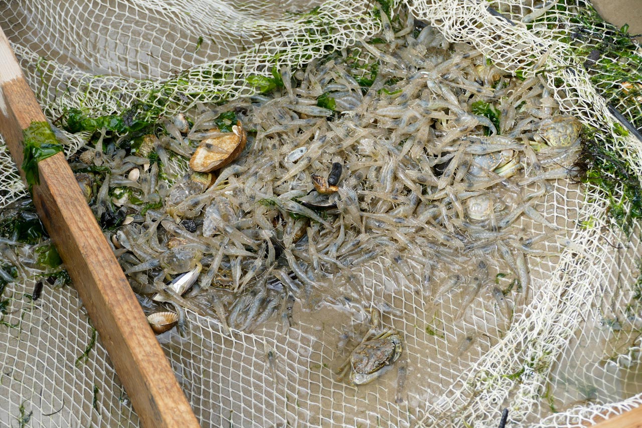 Nach ca. eineinhalb Stunden stießen wir auf einen Priel, in dem uns Herr Petersen-Andresen das Krabbenfischen vorführte. Schon wirklich erstaunlich wie viele Tiere er mit einem kurzen Gang durch den Priel herausfischen konnte: