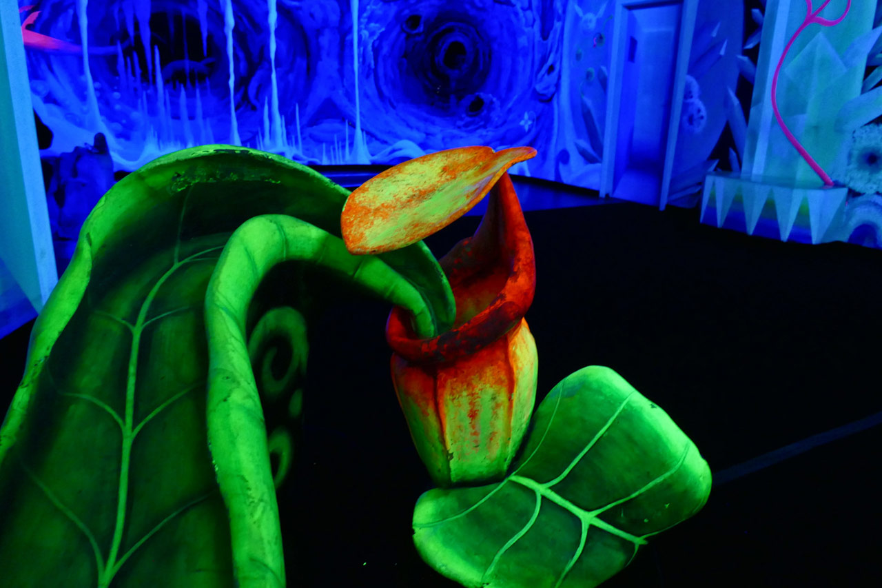 Danach ging es endlich los in den Minigolf-Bereich: Es war ziemlich dunkel und nur das Schwarzlicht hat die bizarr anmutende Raumgestaltung zum Leuchten gebracht. In Kombination mit den 3D-Brillen war die Wirkung ziemlich psychedelisch.