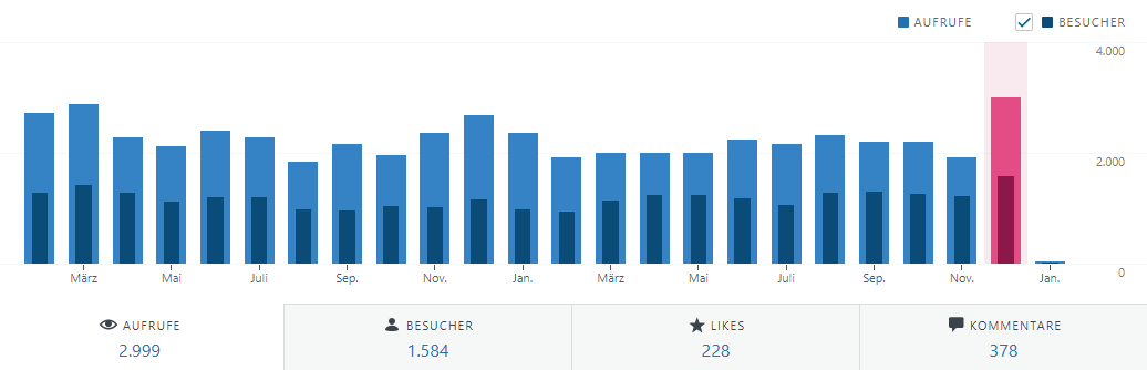 Nachdem es 2018 noch einen größeren Einbruch der Aufrufzahlen gab, blieben diese 2019 relativ stabil und bewegten sich stets im Bereich zwischen 1.900 und 2.300 Aufrufen pro Monat. Nur der Dezember war mit knapp 3.000 Aufrufen ein positiver Ausreißer. Insgesamt gab es ein paar Monate, die waren deutlich stärker als die des Vorjahres (z.B. August), aber auch ein paar, die schlechter abgeschnitten haben (z.B. Januar bis März, die 2018 noch richtig stark waren):