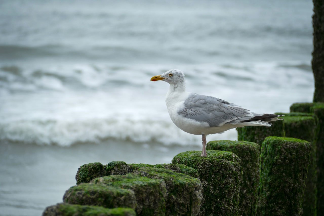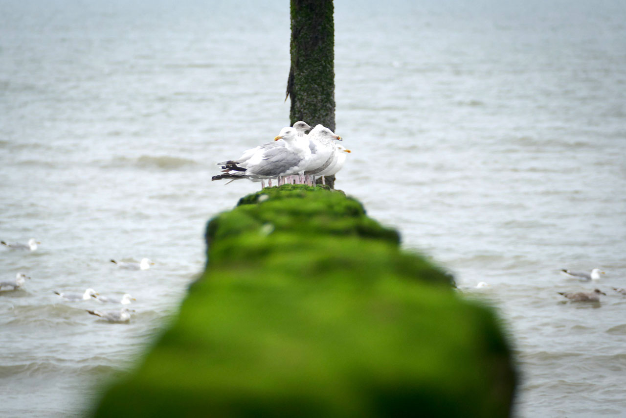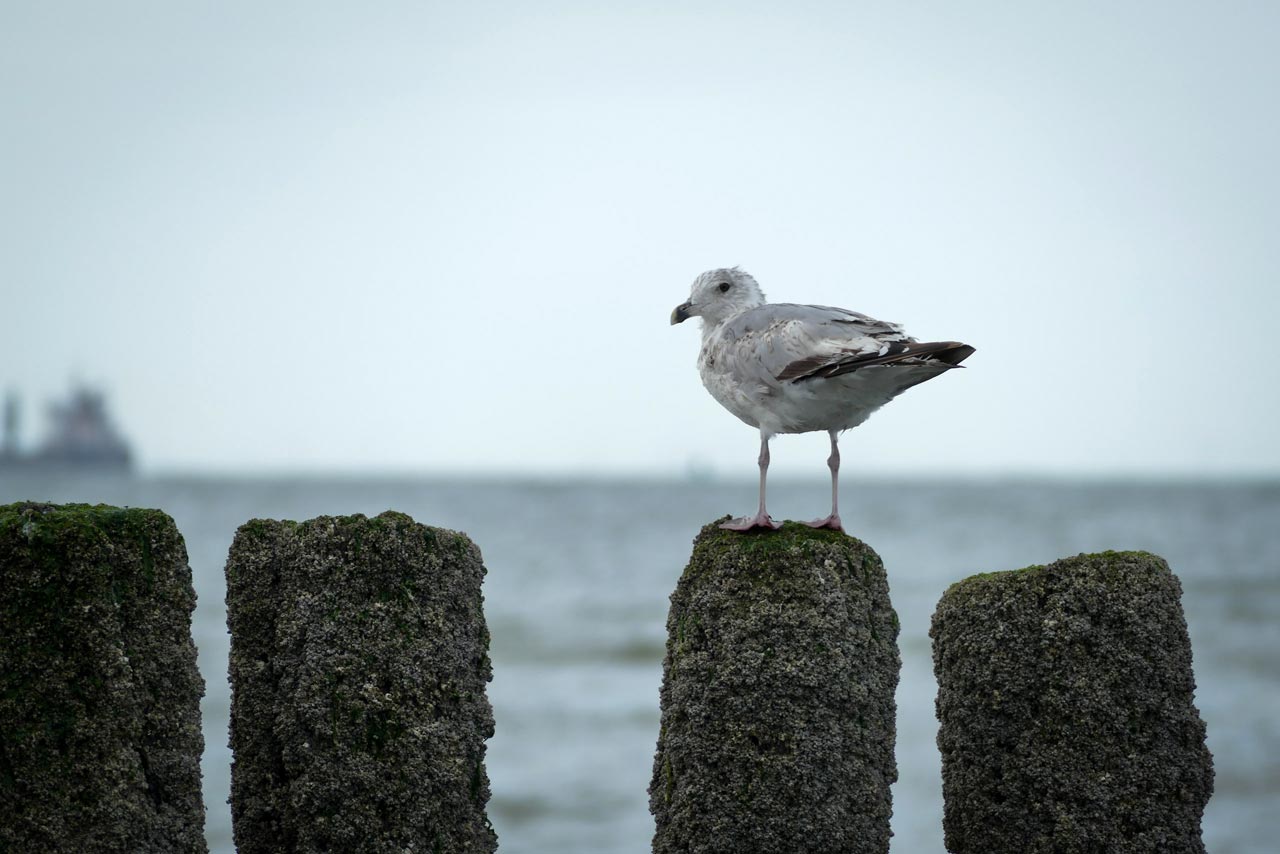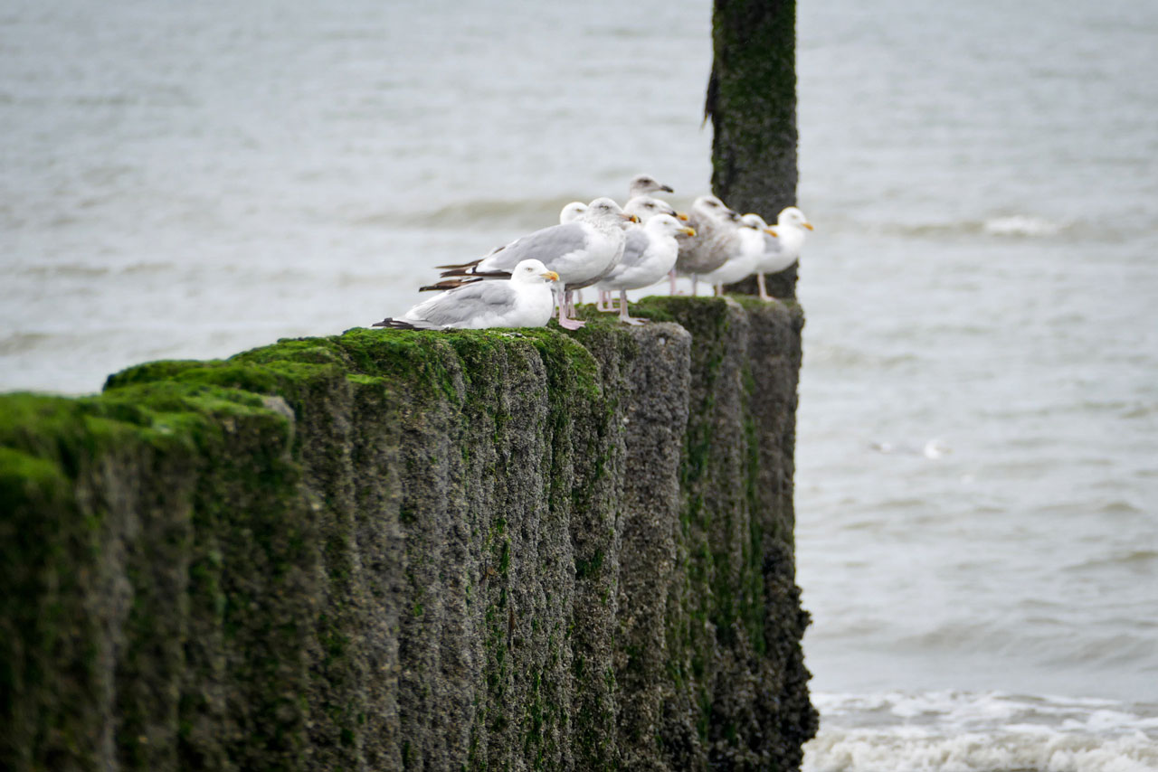 Schon alleine auf den Pfählen der Wellenbrecher unmittelbar an unserem Strandabschnitt gab es unzählige Möglichkeiten, Möwen als Fotomotiv einzufangen: