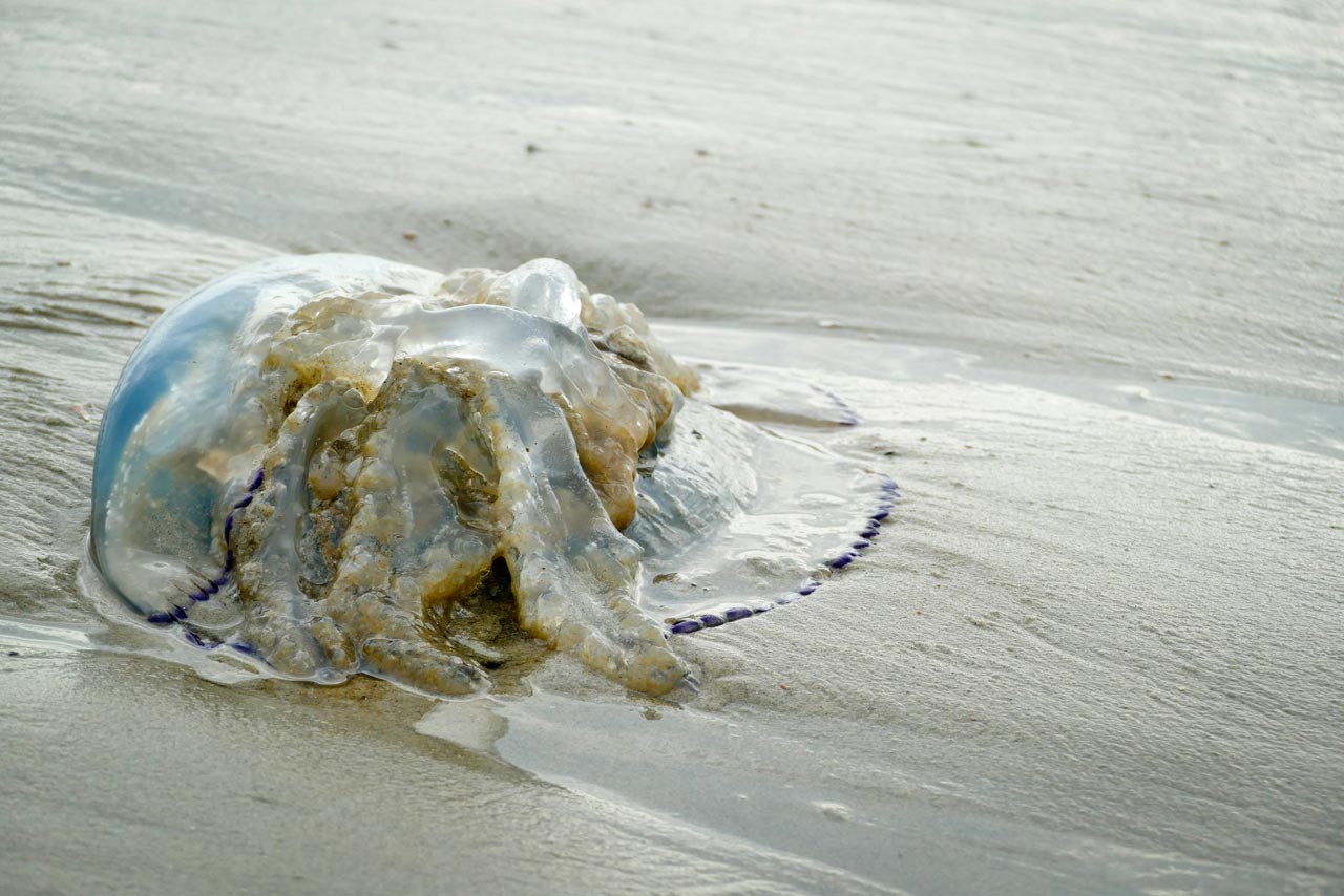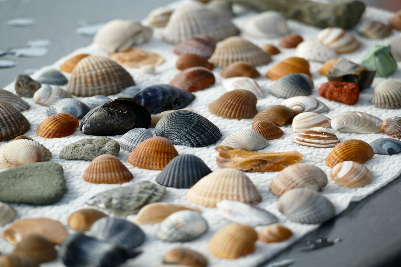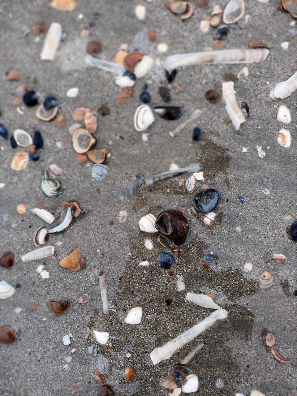 An den sehr windigen Tagen wurden häufig Quallen an den Strand gespült, die eine recht imposante Größe hatten. Diese haben wir natürlich liegen lassen und dafür etliche Muscheln eingesammelt, die nun unser Wohnzimmer zieren: