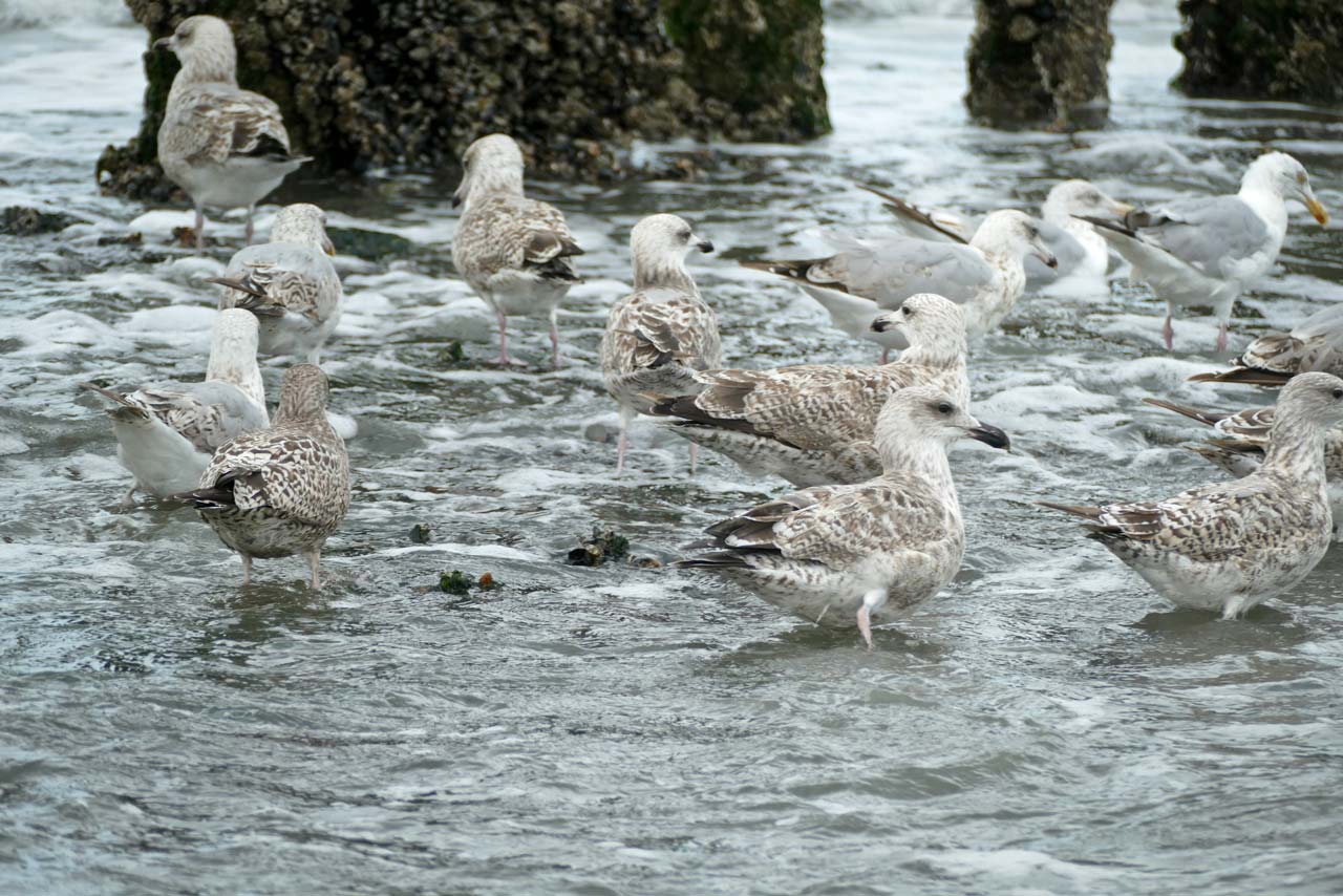 Auch während unseres zweiten Strandspaziergangs sind mir etliche Möwen vor die Linse gekommen. Hier auch vermehrt Jungmöwen, die sich in den Wind gestellt haben: