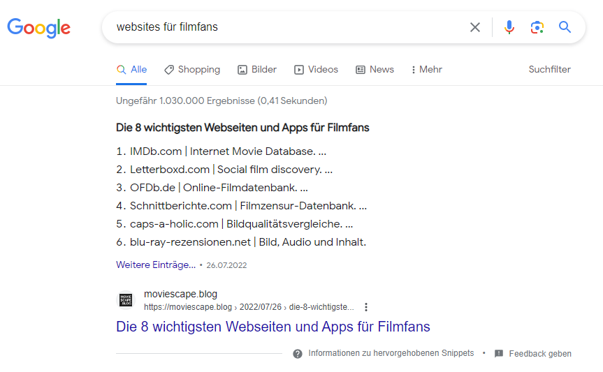 Auch im vergangenen Blogjahr habe ich es nur auf einen einzigen fundierteren Artikel gebracht: „Die 8 wichtigsten Webseiten und Apps für Filmfans“. Ich habe ihn sorgfältig strukturiert und auch für Google aufbereitet geschrieben. Das Ergebnis war ein featured Snippet (siehe Screenshot unten) sowie recht konsistente Aufrufe. Keine großen Zahlen, aber immerhin langsames Wachstum.