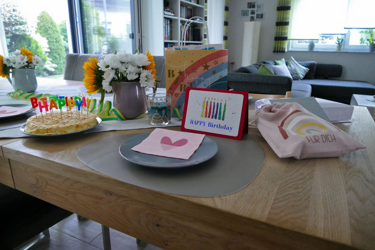 Es war wieder ein Geburtstag mitten in der Woche, sprich der Alltag hatte uns fest im Griff. Dennoch konnten wir morgens recht gemütlich frühstücken und Geschenke überreichen (wobei das große Gemeinschaftsgeschenk ein neues Fahrrad war). Danach ging es für den Rest in die Schule und für mich ins Home Office, von wo ich 20 Minuten bevor die ersten Gäste eintrafen aus dem letzten Call kam.