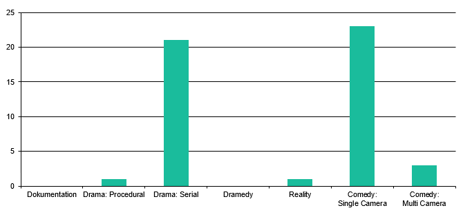 2023 liegen die Comedy-Serien mit Single-Camera (47%) und Multi-Camera (6%) leicht vor den seriell erzählten Dramen (43%). Mit „Jury Duty“ hat es erstmals ein Reality-Format in mein Programm geschafft.