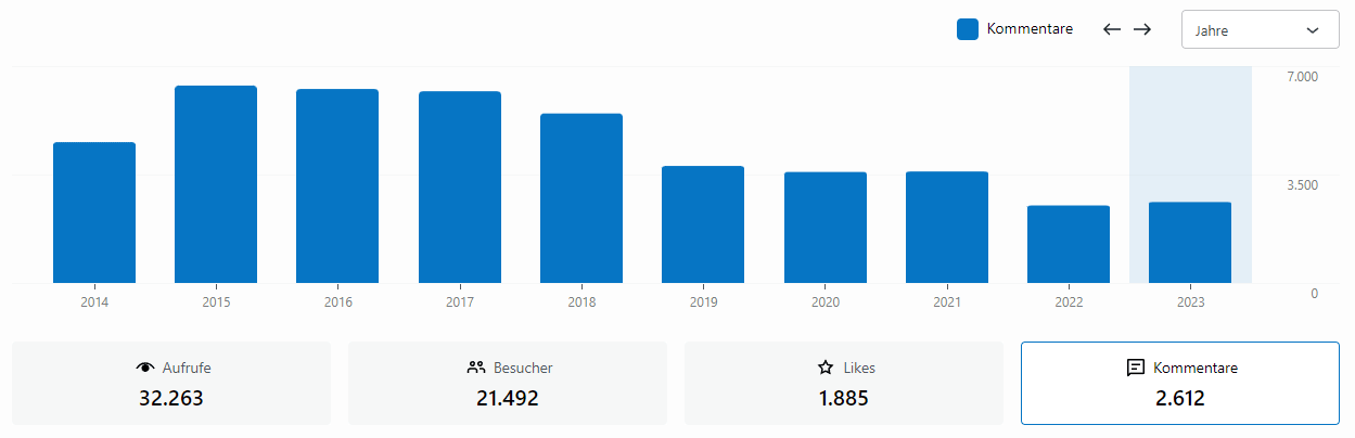 - Kommentare pro Beitrag sind von 5.3 (2022) auf 5.4 (2023) minimal gestiegen