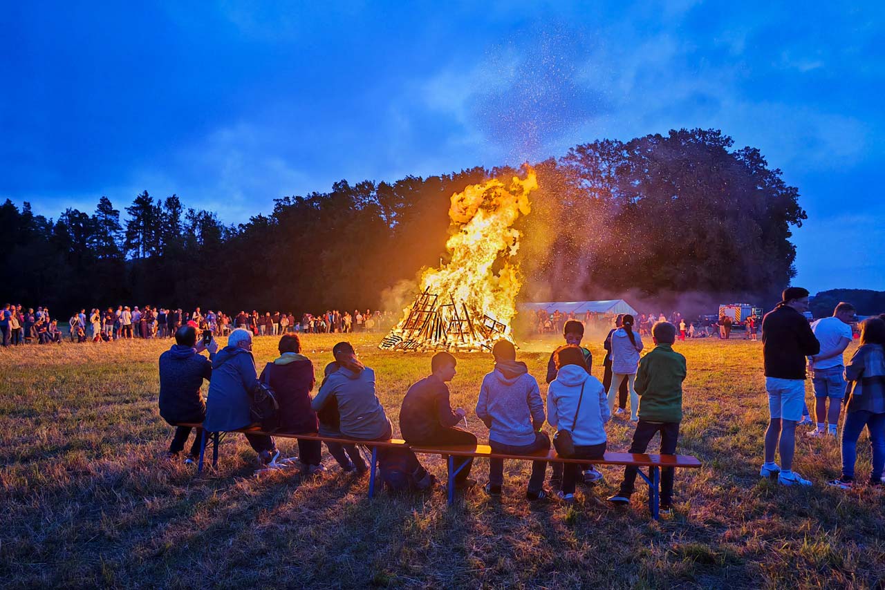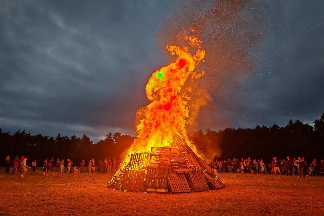 Nach reichlich Speis und Trank haben sich die Kinder mit ihren Freund:innen verlustiert und wir Erwachsenen warteten hauptsächlich auf das Entzünden des Feuers. Es war ohnehin schon sehr windig und als die Sonne dann untergegangen war, wurde es sogar richtig kalt. Gegen 21:00 Uhr wurden dann die Fackeln an die Kinder verteilt und hunderte von Lichtpunkten bewegten sich über das Feld, um den großen Holzhaufen zu entzünden.