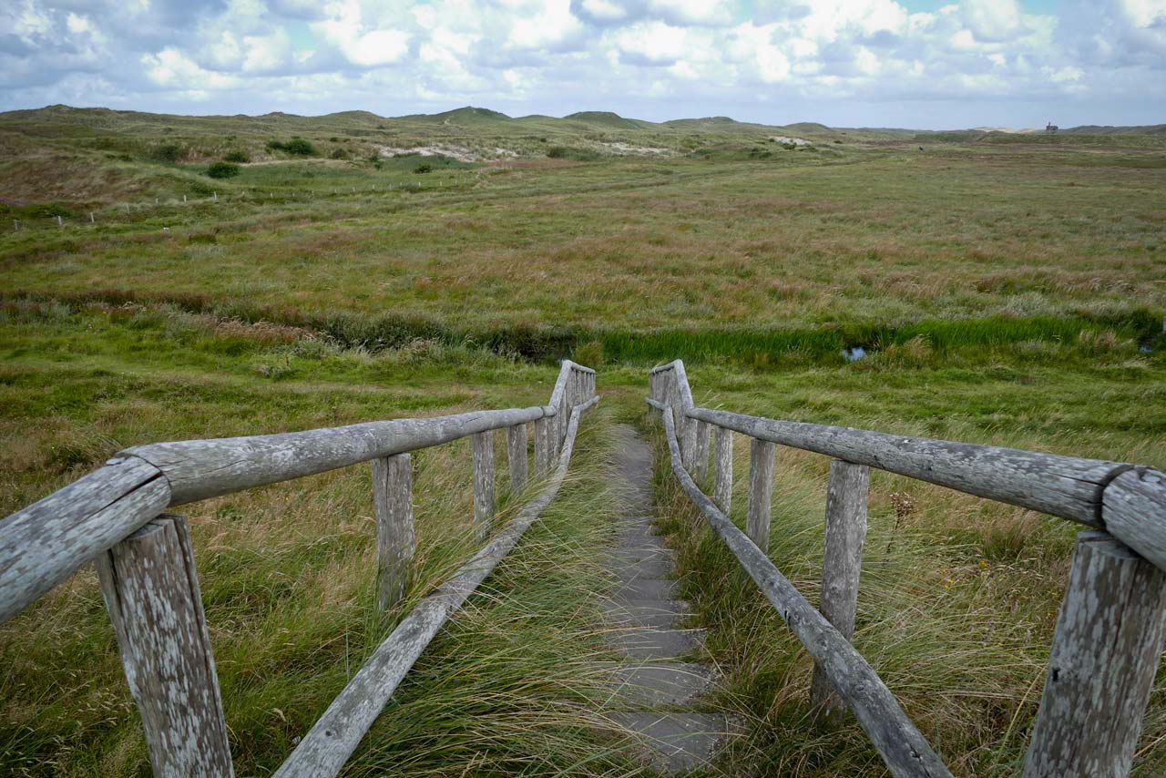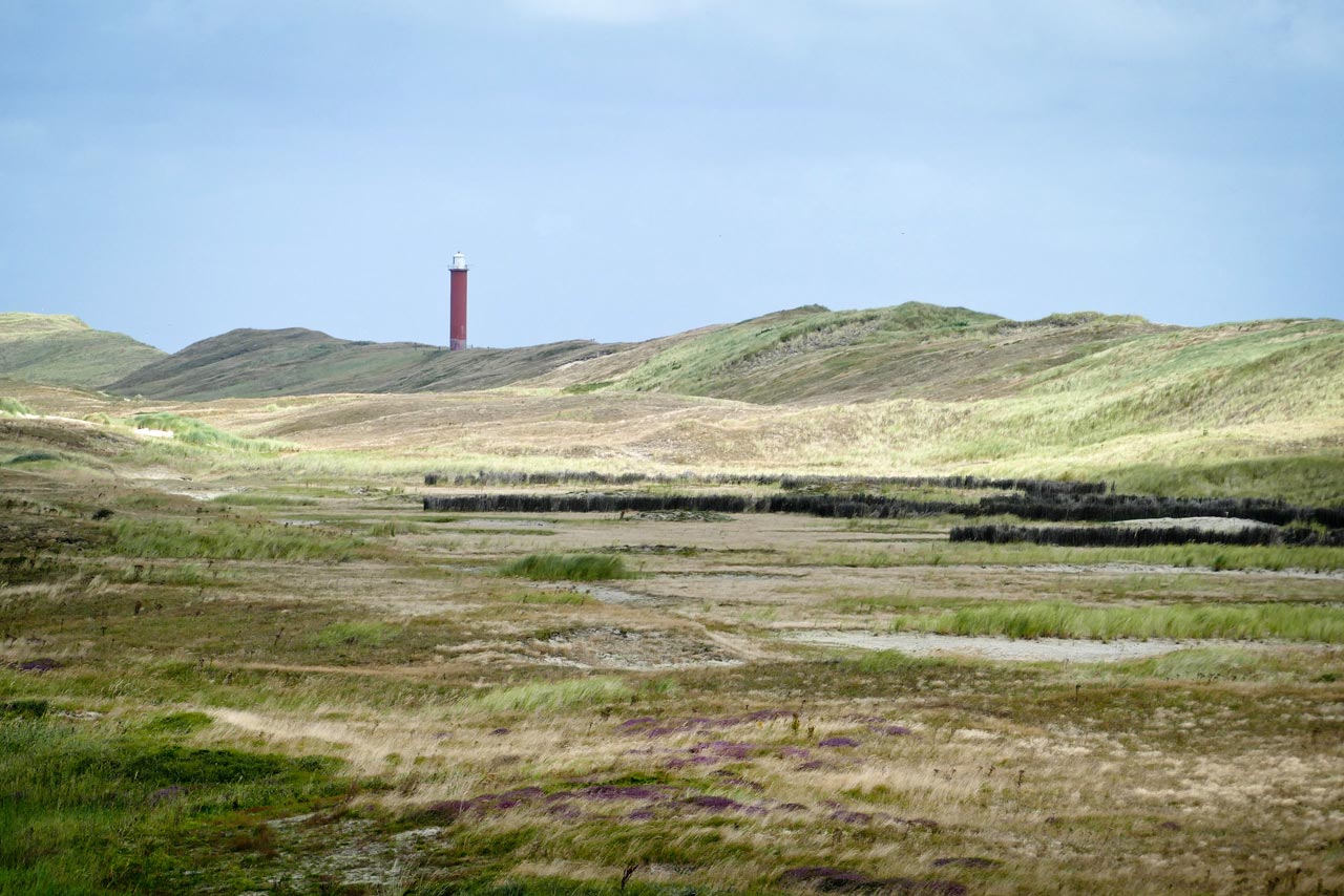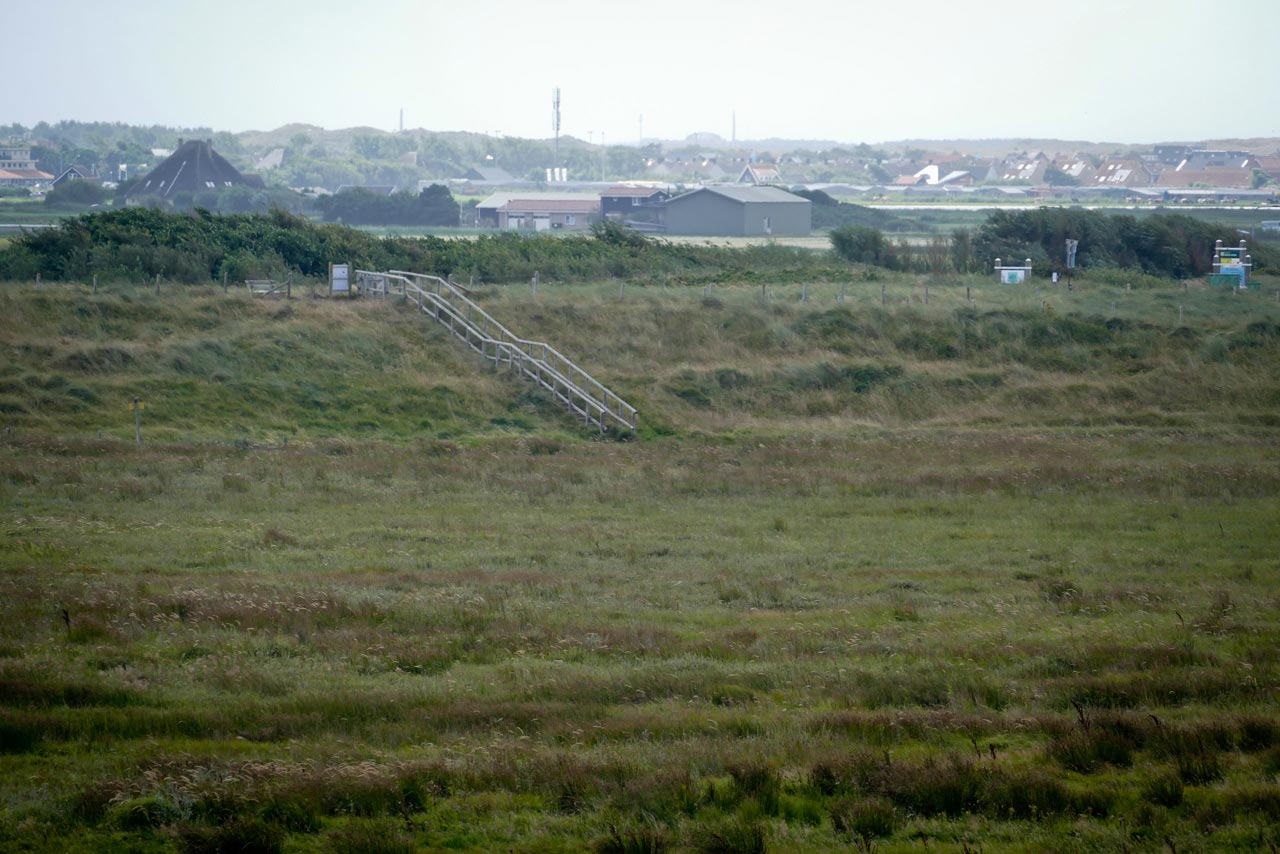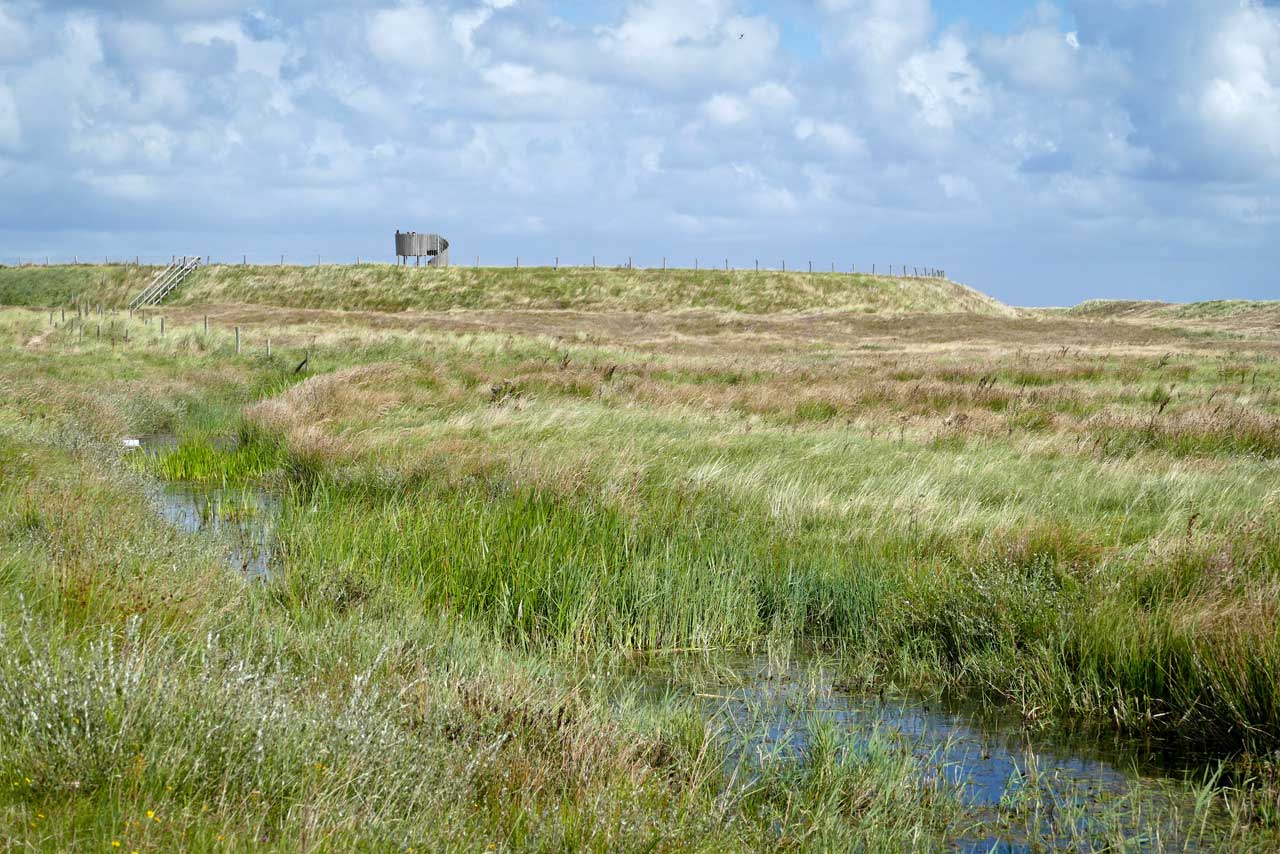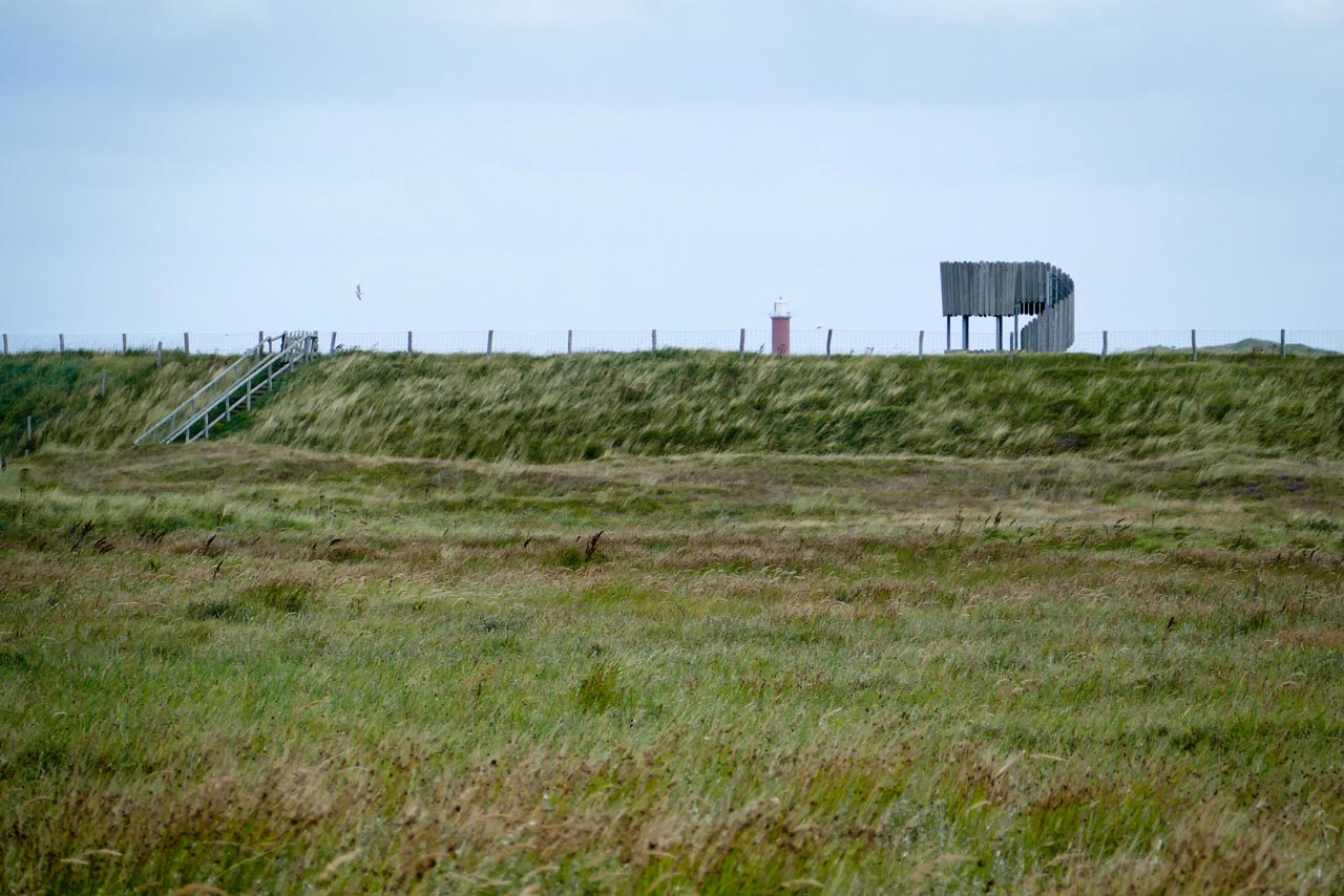Der Weg durch die Graslandschaft war noch relativ windgeschützt, doch auf dem Aussichtsturm wurden wir fast weggeweht. Dafür hatten wir noch eine schöne Aussicht über die Landschaft. Der Leuchtturm am Horizont war übrigens der Wendepunkt bei meinem ersten Urlaubslauf.