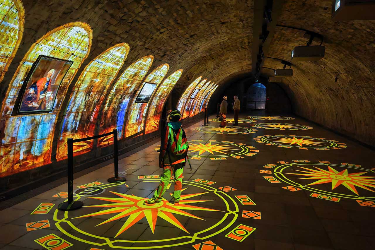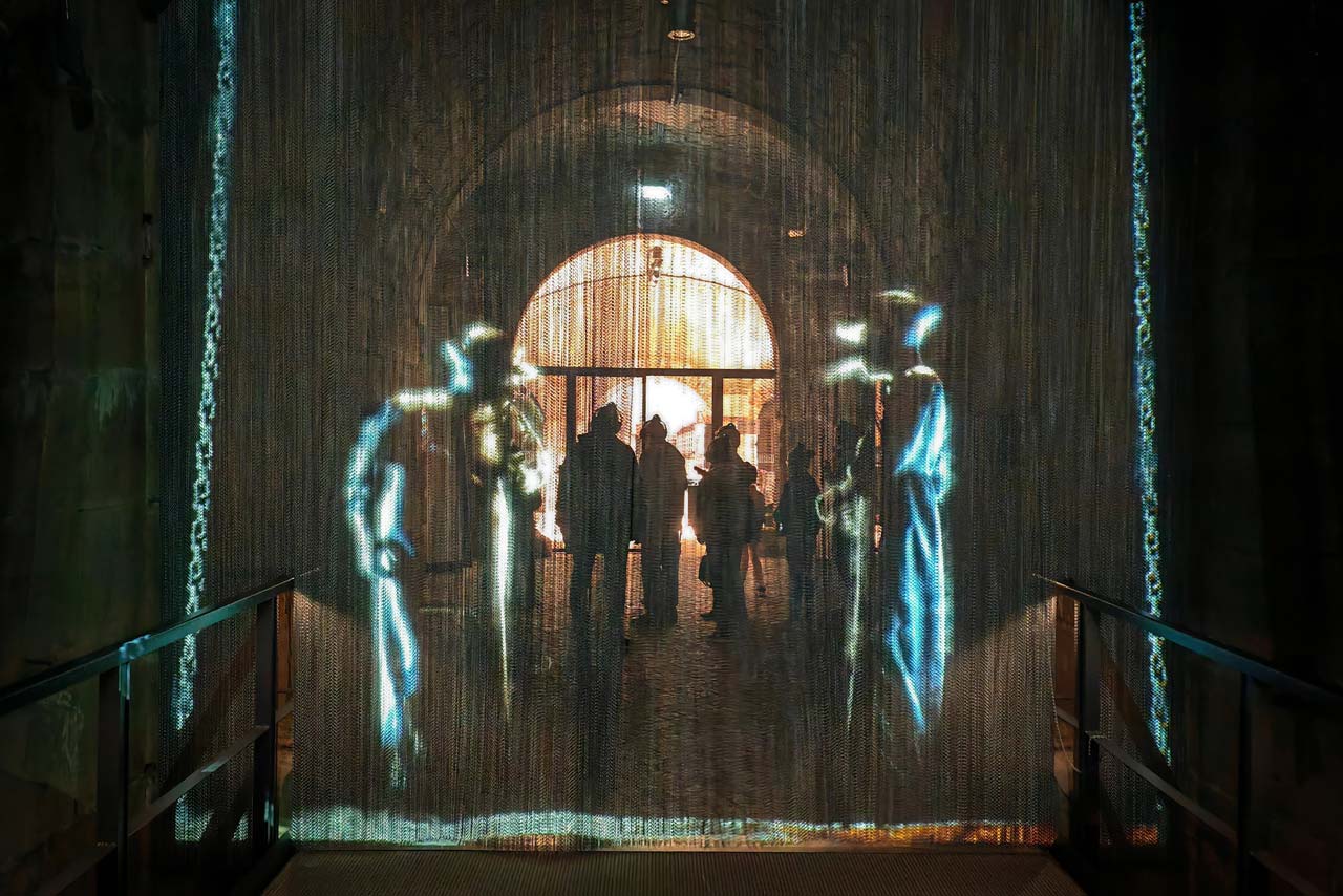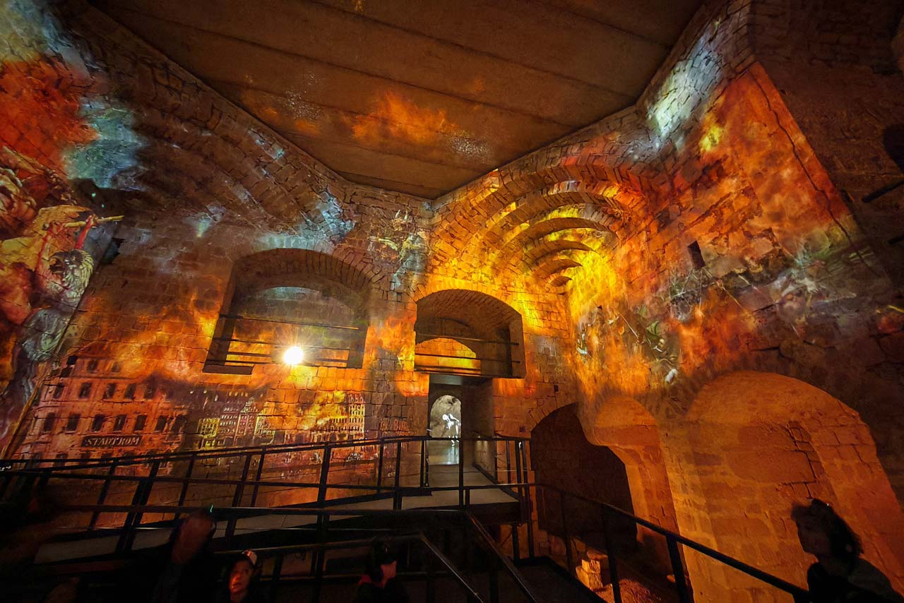 Als Besucher bekommt man die Geschichte der Dresdner Befestigungsanlagen erzählt. Dabei hat uns der Geist von Kurfürst Moritz von Sachsen begleitet, der uns durch die Historie führt. Als Zuschauer und vor allem Zuhörer bekommt man dabei allerlei zu sehen und zu hören. An verschiedenen Stationen wurden großflächige Animationen abgespielt, die den realen Raum wunderbar aufgreifen und erweitern. Beeindruckt hat mich auch die akustische Aufbereitung, denn wir haben uns durch einen 3D-Audio-Raum bewegt. Ein sehr immersives, multimediales Erlebnis.