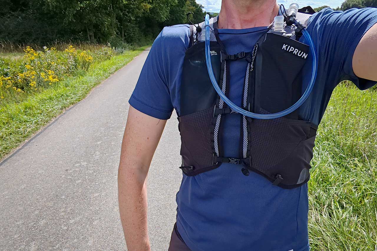 Ich hatte erstmals meine neue Laufweste an, die ich zum Geburtstag geschenkt bekommen habe. Meine bisherige Weste ist eine Radweste und sitzt daher zu locker. Sprich ich reibe mir unter den Armen alles auf. Da wir vor unserem Urlaub beim Decathlon waren, habe ich direkt ein paar Laufwesten probiert und mich für die Kiprun-10l-Weste in Größe XL entschieden. Normalerweise trage ich T-Shirts in Größe M, doch Decathlon schneidet ohnehin sehr klein, so dass mir die Weste in Größe M/L zu klein schien. Nach dem Lauf muss ich leider feststellen, dass auch diese Weste etwas scheuert. Doch zu groß? Ich glaube, ich muss mein Befestigungskonzept noch optimieren. Alles andere hat aber gut funktioniert und die Gewichtsverteilung von 2l-Trinkblase hinten auf 1l hinten und zweimal 0,5l vorne ist definitiv angenehmer: