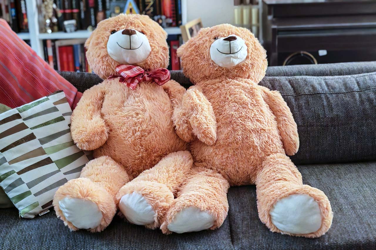 Zwei große Kuscheltiere (Teddys) chillen auf dem Sofa